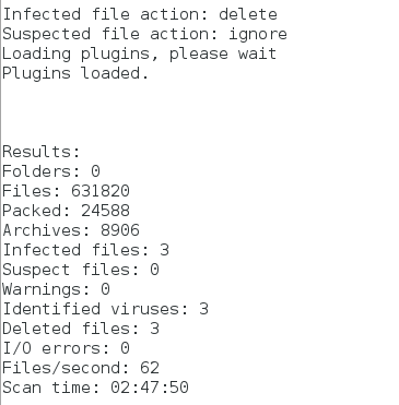 Como explicación de la línea del comando decir que /ruta-a-escanear es el fichero o directorio que queremos escanear. También puede ser un disco duro externo montado en nuestro árbol de directorios. Usamos el modificador delete para la opción action pero puede tomar los valores disinfec, desinfectar, quarantine, poner en cuarentena, delete, borrar o ignore, ignora todas las amenazas encontradas, podéis elegir el modificador que más os convenga a vosotros. La opción --log grabará un archivo en este caso reportebdscan.log con un informe de los todos archivos analizados y el resultado del análisis, que se guardará, si no se indica una ruta alternativa, en el directorio en el que se ha ejecutado el comando. Os dejamos una captura de pantalla con el resultado final de todo el proceso.