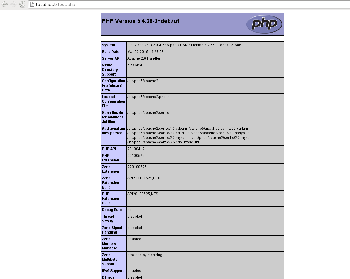 Si ahora accedemos a localhost/test.php a través de nuestro navegador veremos una página parecida a esta: