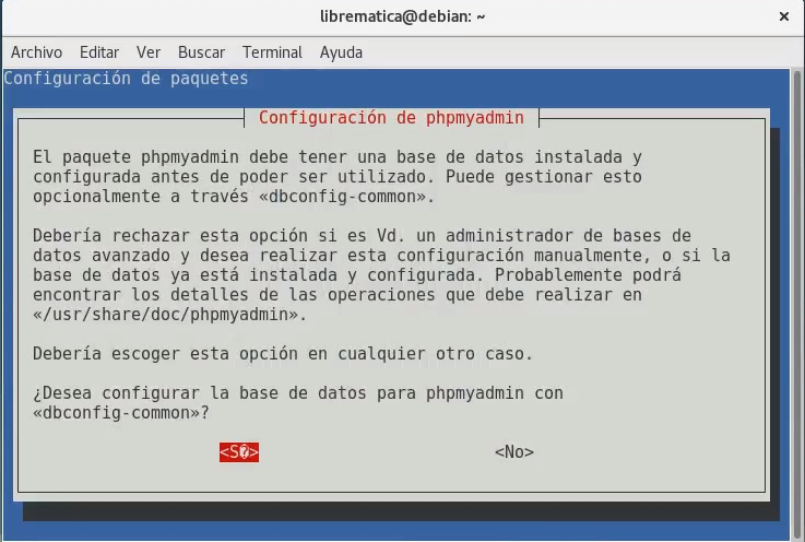 El asistente también nos pregunta si queremos que dbconfig haga la configuración por nosotros. Elegimos "Sí" para que mariadb se configure de manera automática.