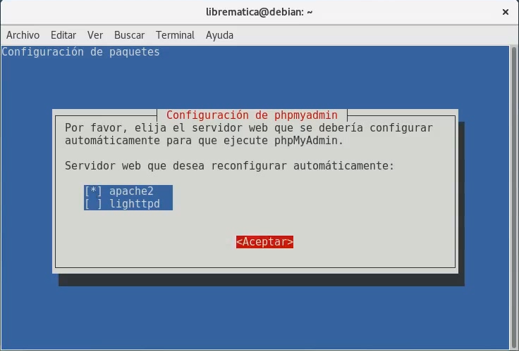 El asistente de instalación nos preguntará por el servidor web que debe configurar de manera automática.
